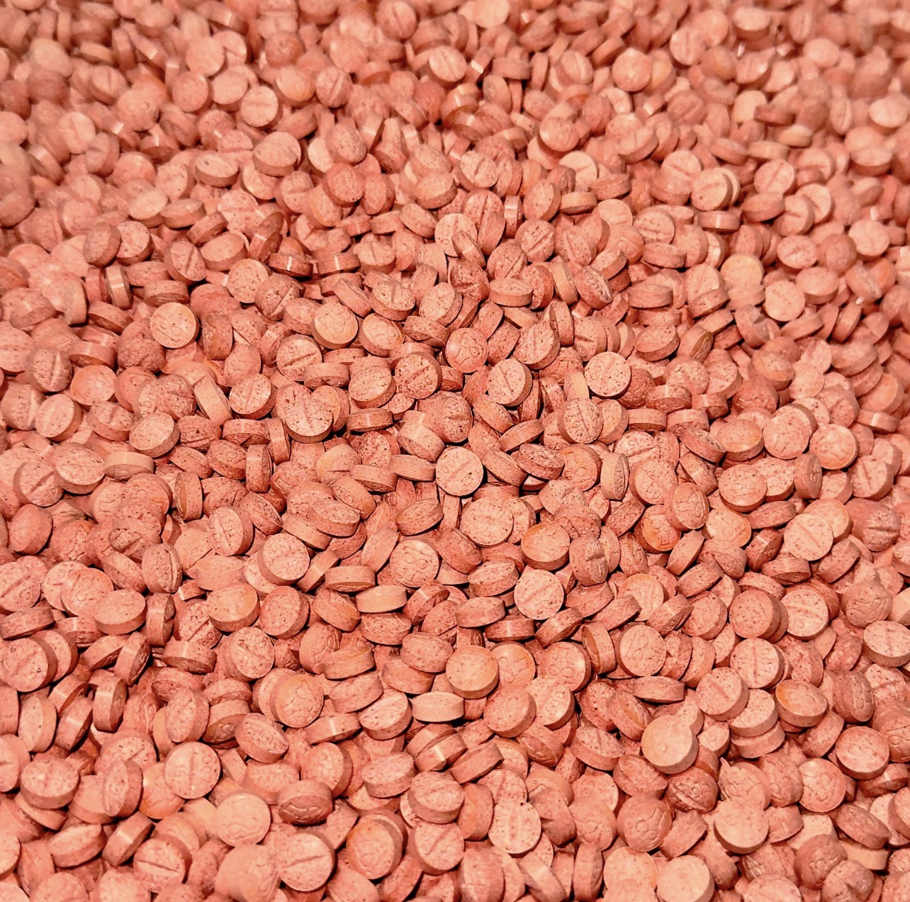 The 7oh tablets features a striking pinkish color from real organic freeze-dried strawberries, imprinted with a logo on one side and the dosage on the other.